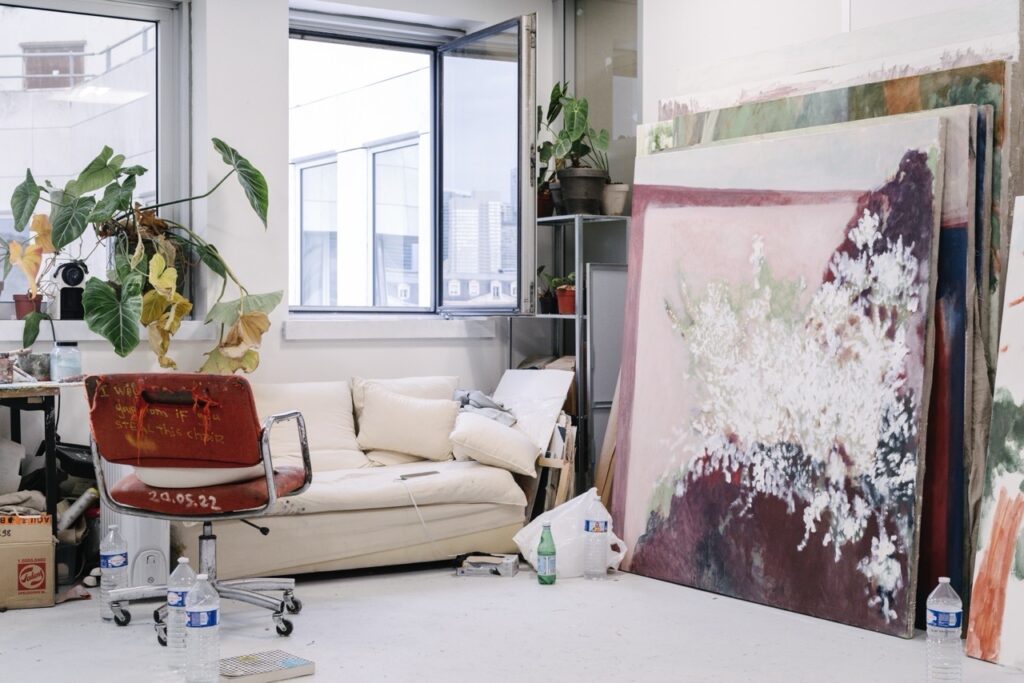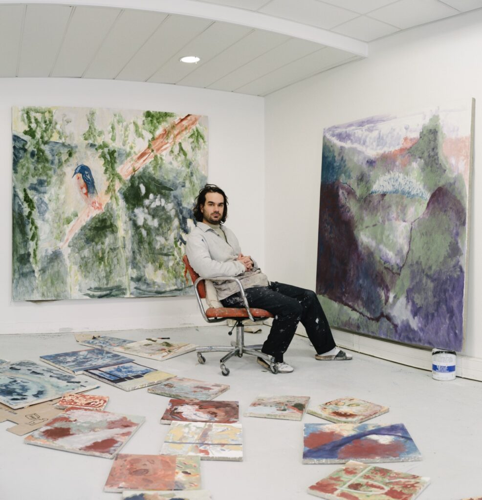 The studio of Lucas Talbotier, wherever it settles, is for me a kind of island. These days, magnificent exotic plants that he grows in pots stand beside a large window, facing the tall towers of La Défense and the mineral expanses of the Parisian suburbs below. His small canvases, aligned horizontally on the wall facing this landscape, in turn form a curious archipelago, where walks, emotions, and all the love the painter has retained for places and people, as well as for the work of certain artists who came before him, take on the colors and forms of a grammar he patiently refines over the course of months.